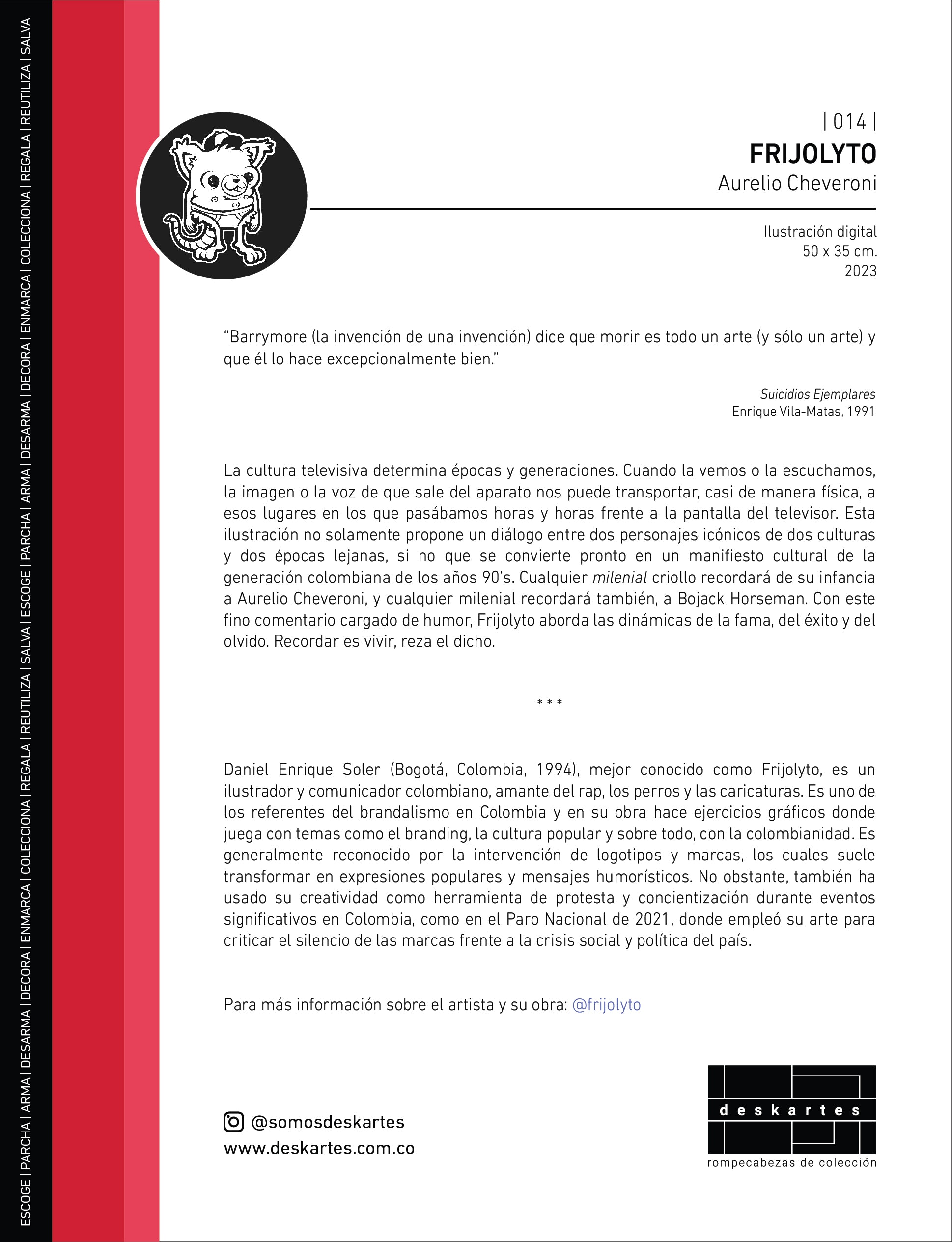 Nuestro rompecabezas Aurelio Cheveroni hace parte de la cultura televisiva que determina épocas y generaciones. Cuando la vemos o la escuchamos, la imagen o la voz de que sale del aparato nos puede transportar, casi de manera física, a esos lugares en los que pasábamos horas y horas frente a la pantalla del televisor. Esta ilustración no solamente propone un diálogo entre dos personajes icónicos de dos culturas y dos épocas lejanas, si no que se convierte pronto en un manifiesto cultural de la generación colombiana de los años 90’s. Cualquier milenial criollo recordará de su infancia a Aurelio Cheveroni, y cualquier milenial recordará también, a Bojack Horseman. Con este fino comentario cargado de humor, Frijolyto aborda las dinámicas de la fama, del éxito y del olvido. Recordar es vivir, reza el dicho.